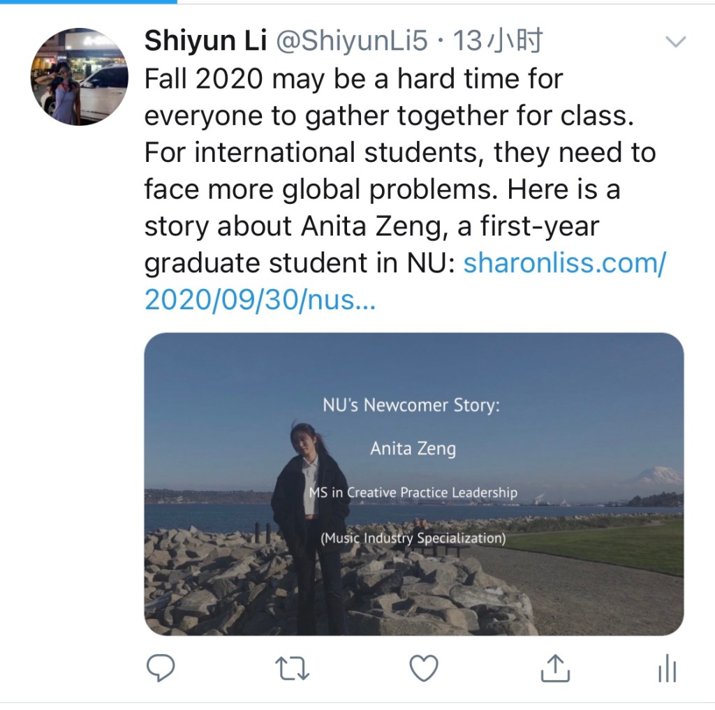 Anita Zeng completed her bachelor’s degree in music composition in a college near Seattle, WA. After that, she applied for a one-year OPT and did her internship in a symphony orchestra in Washington. To broaden her understanding of the music industry, she decided to pursue a graduate study in music management. However, there are not many schools setting up graduate programs in this specific field. She submitted her graduate application to three different schools. Northeastern is one of them.