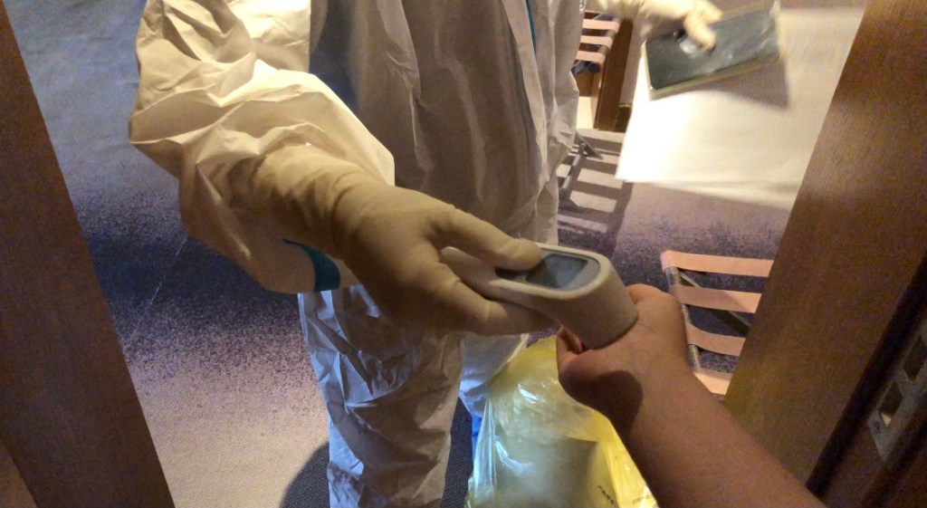 At about 10 am, the staff in protective clothing would knock on our door one by one and said, “checking body temperature!” We need to take our temperature twice a day, once in the morning (10 am) and once in the afternoon (2 pm).