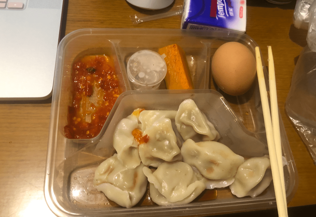 Time to have breakfast! The staff would bring me three meals a day, breakfast, lunch, and dinner. They would put the meal at my room door three times a day. I’m not fussy, and I love Chinese food, so I think my meals were good. What’s more, the staff gave us a yellow garbage bag every day to hold our daily garbage. I always put all of my trash into the trash bag and put it at my door every night before I went to sleep. We did not need to worry about our trash bags; the staff would help us deal with them the next morning.